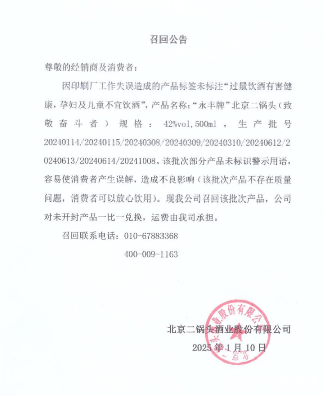酒业股份无限公司(以下简称“二锅头”)做出行政惩罚,12月23日,记者从该公司相关部分获悉,涉案产物已大面积召回。